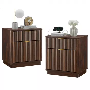 Modern Fluted Nightstand Set of 2 with Charging Station, 2 Drawers, 23 Inch